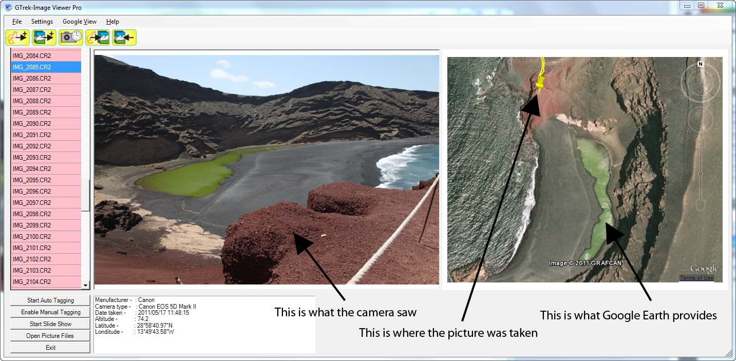 With GTrek's-GeoTagger you can view all the major image file formats (see below), display image information and GeoTagged data in textural form as geographical coordinates and as an actual location in Google Earth.